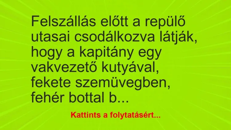 Felszállás előtt a repülő utasai csodálkozva látják, hogy a kapitány egy vakvezető kutyával, fekete szemüvegben, fehér bottal botladozik a pilótafülke felé.