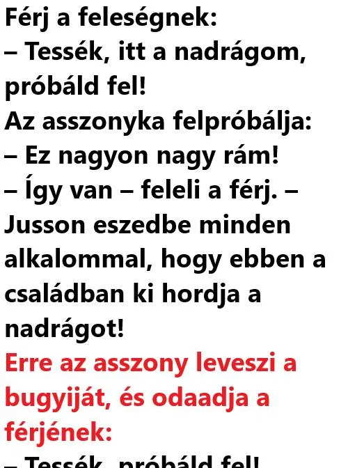– Jusson eszedbe minden alkalommal, hogy ebben a családban ki hordja a nadrágot!