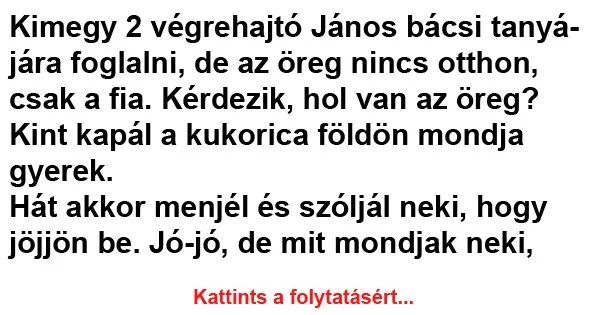 Kimegy 2 végrehajtó János bácsi tanyájára foglalni, de az öreg nincs otthon, csak a fia.