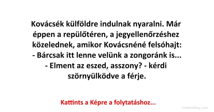 Már éppen a repülőtéren, a jegyellenőrzéshez közelednek, amikor Kovácsnéné felsóhajt: