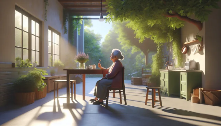 A nénike ül a padon a parkban, és az unokáját várja.
