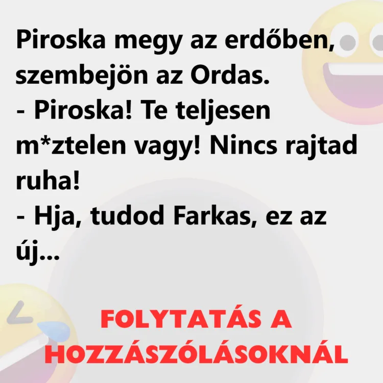 Vicc: Piroska odaér a nagymama házához és bemegy.– Nagymama!