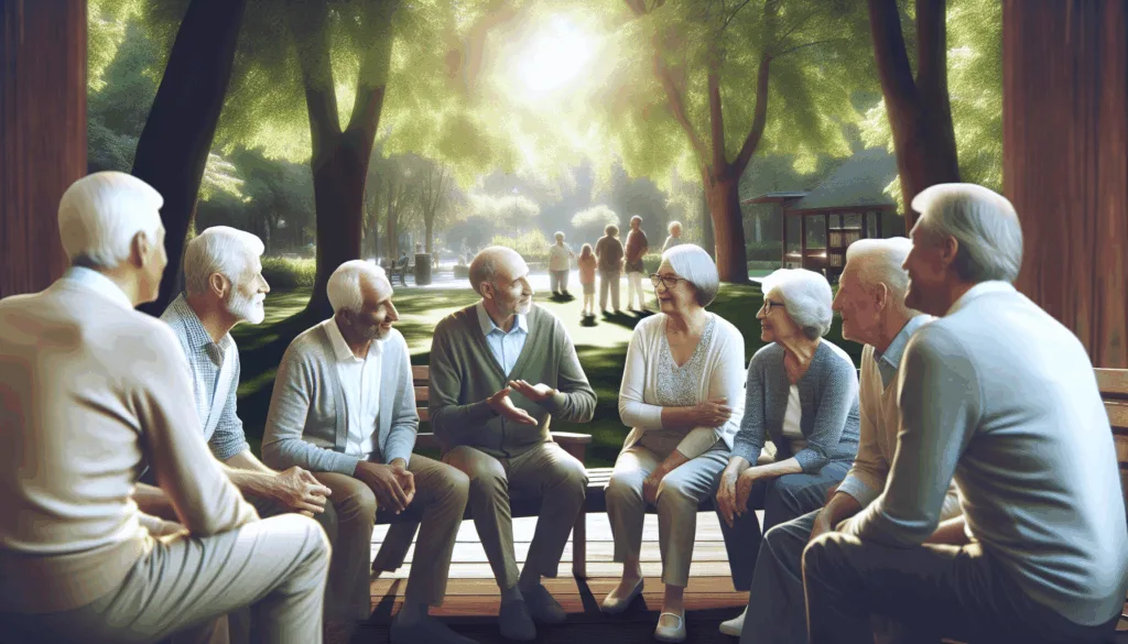 Több nyugdíjas összejön a parkban, és beszélgetnek.