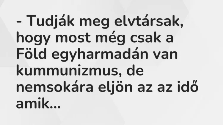 – Tudják meg elvtársak, hogy most még csak a Föld egyharmadán van kummunizmus, de nemsokára eljön az az idő amikor az egynegyedén, sőt az egynyolcadán is kummunizmus lesz!