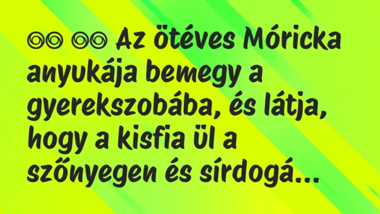 Az ötéves Móricka anyukája bemegy a gyerekszobába, és látja, hogy a kisfia ül a szőnyegen és sírdogál.