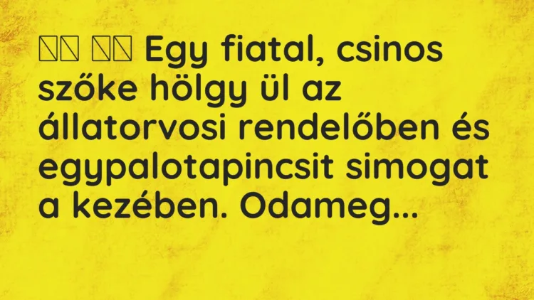 Egy fiatal, csinos szőke hölgy ül az állatorvosi rendelőben és egy