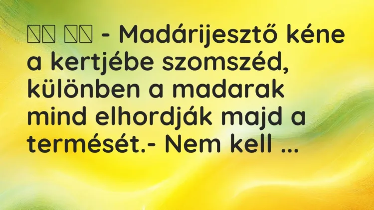 – Madárijesztő kéne a kertjébe szomszéd, különben a madarak mind elhordják majd a termését.