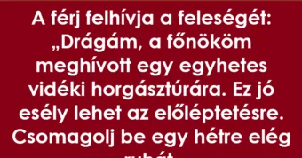 A férj felhívja a feleségét: „Drágám, a főnököm meghívott egy egyhetes vidéki horgásztúrára. Ez jó esély lehet az előléptetésre. Csomagolj be egy hétre elég…