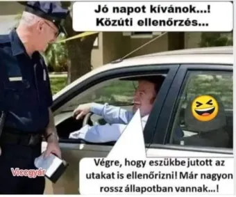 Vicc: A rendőr leállítja az autóst az autópályán, és megkérdi tőle: -…A rendőr leállítja az autóst az autópályán, és megkérdi tőle:- Uram, megkérdezhetem, mióta megy…